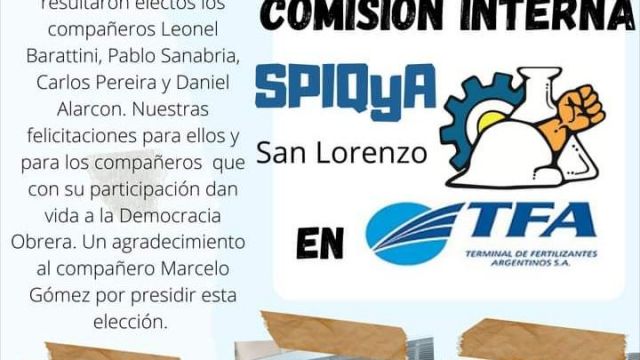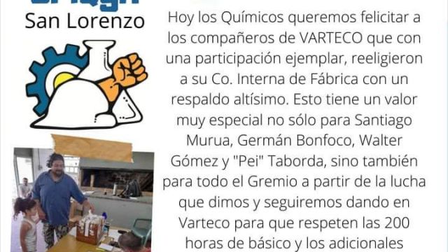 El 28 del mismo mes se llevaron a cabo las elecciones para renovar comisión interna para la planta Varteco en San Lorenzo, resultando electos por los compañeros Santiago Murúa, Germán Bonfoco, Walter Gómez y Darío Taborda, quienes serán los nuevos delegados de fábrica.