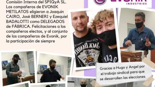 La democracia obrera en cada lugar de trabajo se vivió con alegría y entusiasmo en una verdadera maratón electiva que comenzó el 14 de octubre con las elecciones en la planta Evonik Metilatos de PGSM donde los compañeros eligieron a Joaquín Cairo, José Berneri y Ezequiel Badalotti como delegados de fábrica por los próximos dos años.