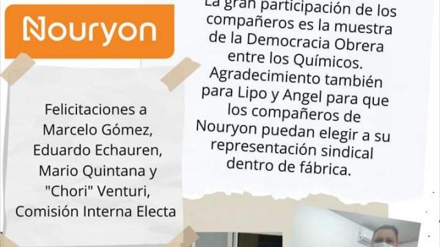 El 15 de octubre se realizó la segunda jornada electiva, en este caso en la planta Nouryon en San Lorenzo, donde los compañeros químicos eligieron a Marcelo Gómez, Eduardo Echauren, Mario Quintana y Héctor Venturi como delegados de fábrica.